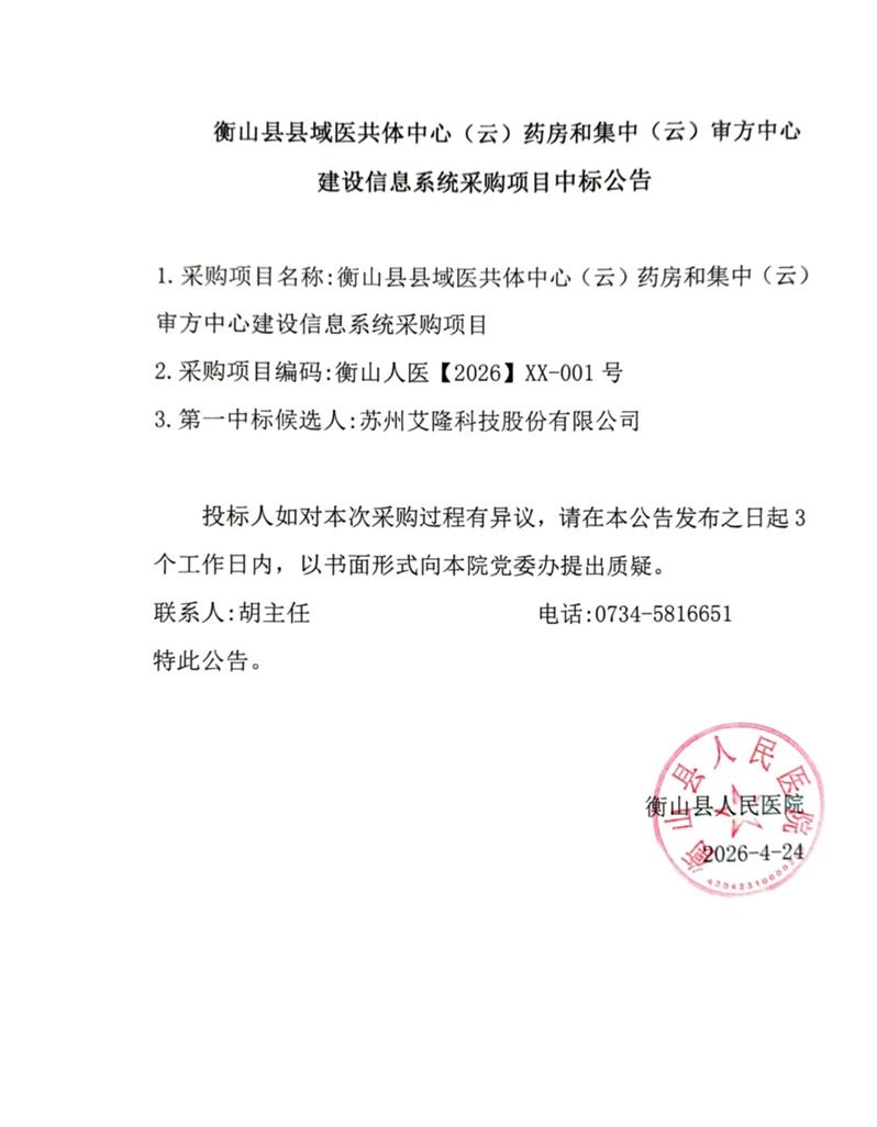 衡山县县域医共体中心(云)药房和集中(云)审方中心建设信息系统采购项目中标公告