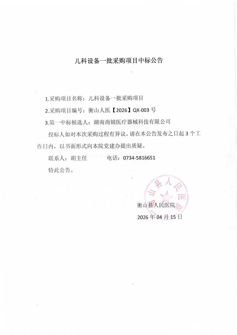 儿科设备一批采购项目中标公告